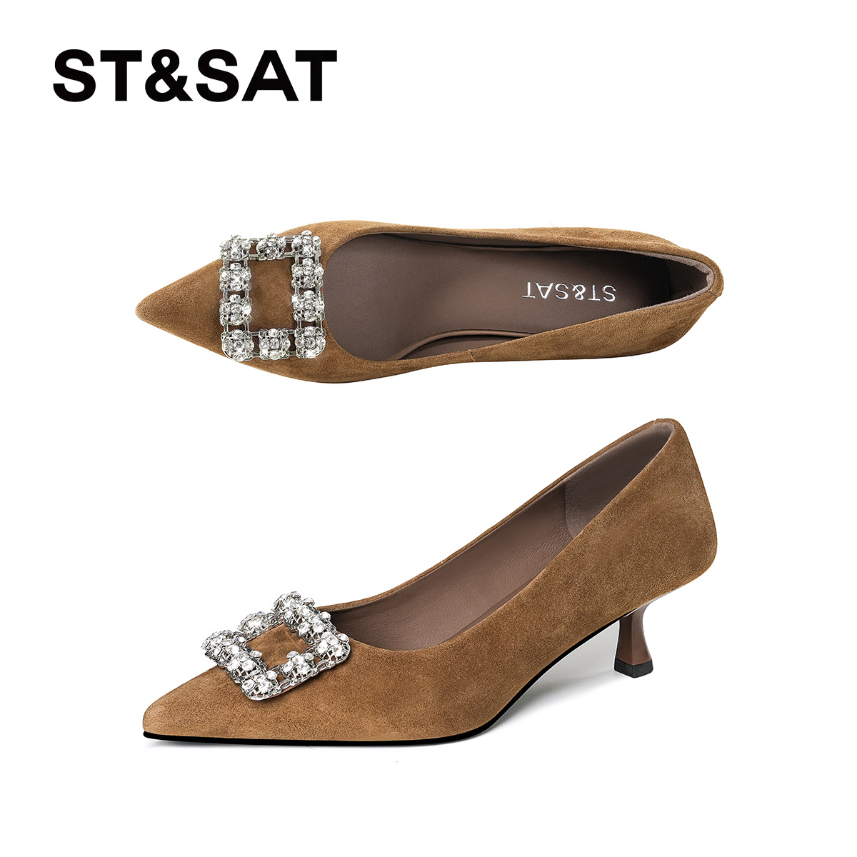 星期六英伦风高跟鞋女2025真皮细跟浅口尖头水钻单鞋晚宴时装女鞋
