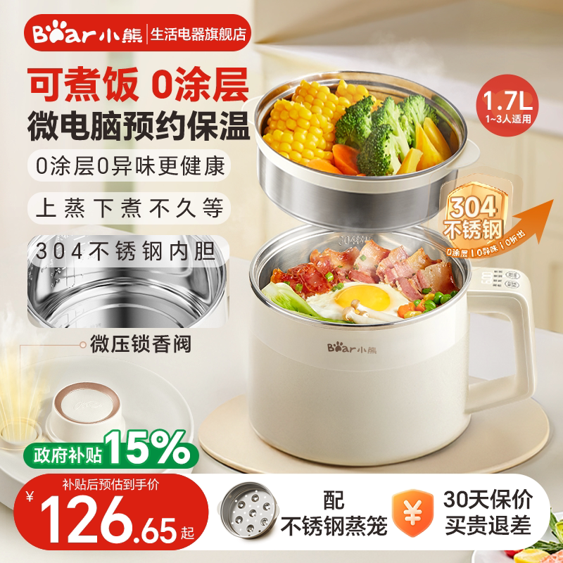 小熊电煮锅不锈钢0涂层宿舍电煮锅小型蒸锅泡面小电锅多功能火锅