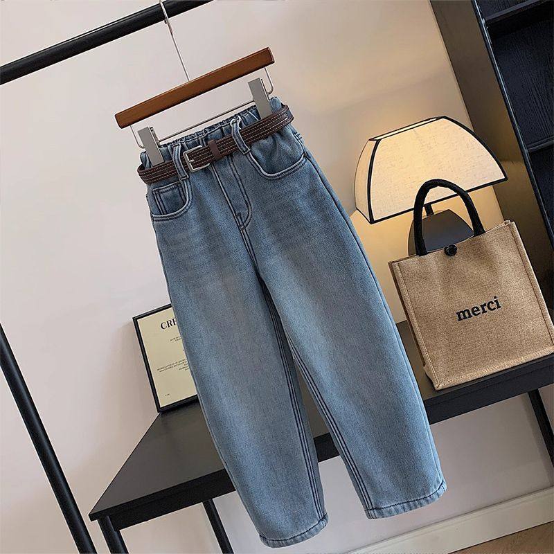 女孩韩版宽松一体绒牛仔裤儿童春秋冬季加绒萝卜裤女童宽松老爹裤