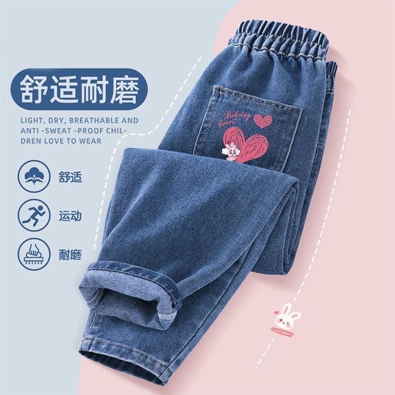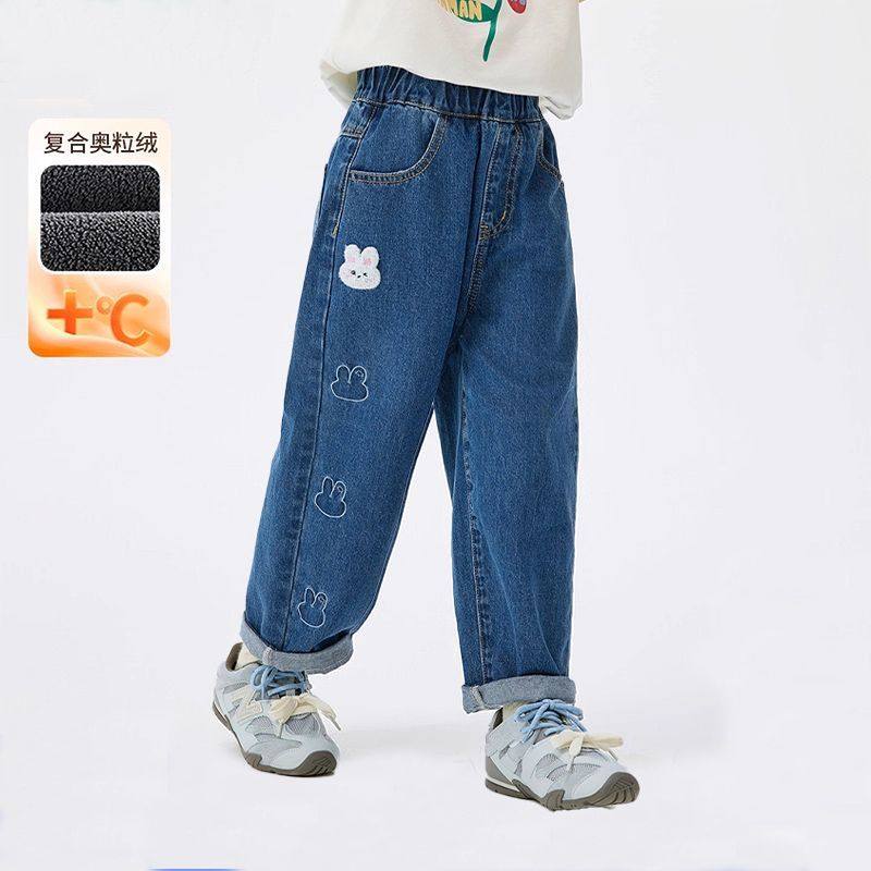 女童韩版牛仔裤儿童春秋冬季水洗印花裤子中大童一体绒宽松萝卜裤