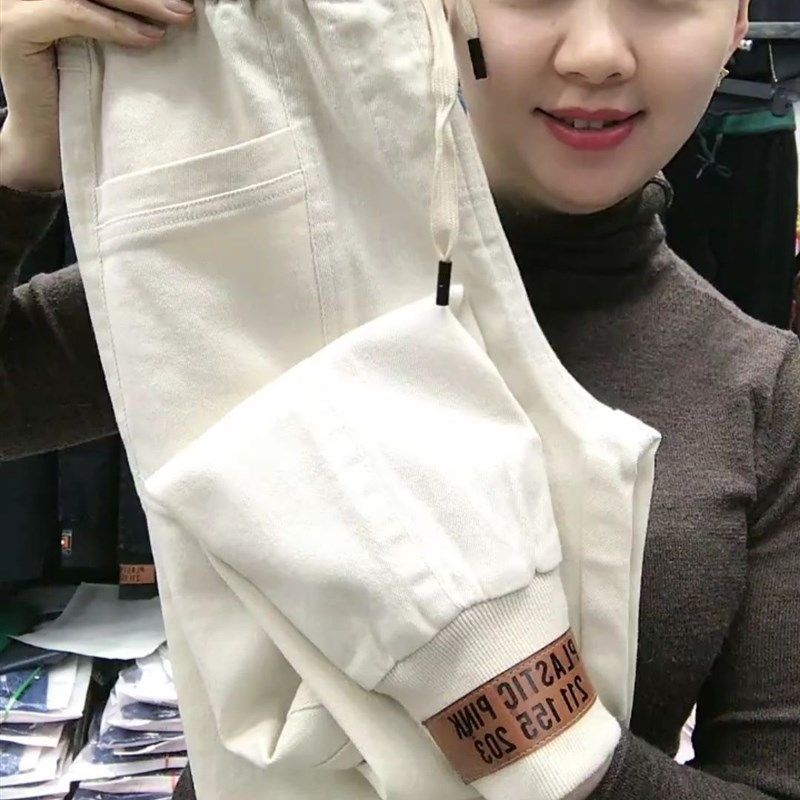2023秋冬新款韩版加绒牛仔裤女米色高腰宽松休闲萝卜裤束脚哈伦裤