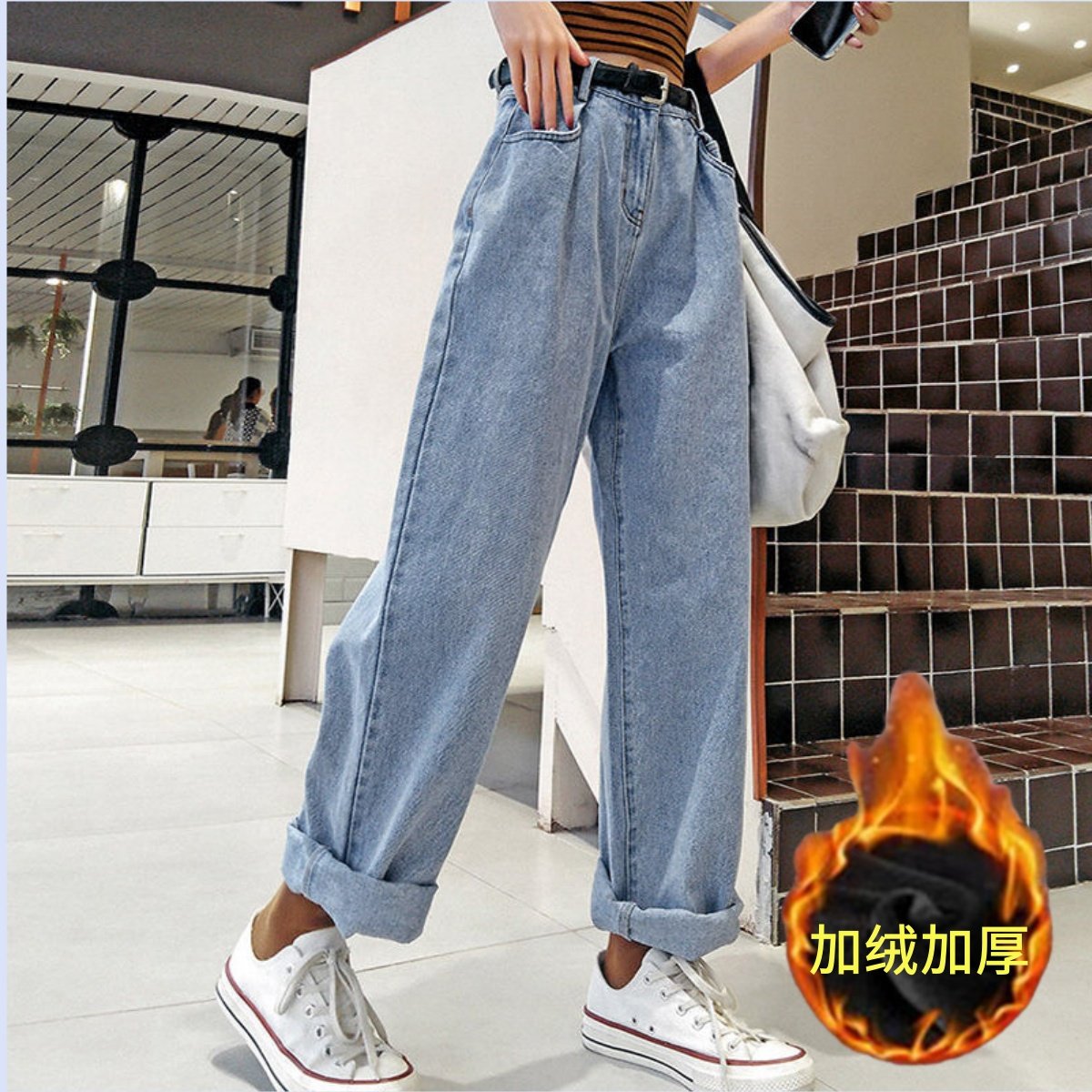 2022年秋冬加绒加厚百搭牛仔裤女宽松韩版学生新款显瘦哈伦萝卜裤