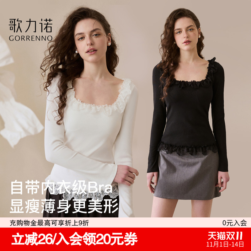 森女部落甜美白色修身蕾丝花边打底衫女秋冬季内搭可外穿长袖T恤