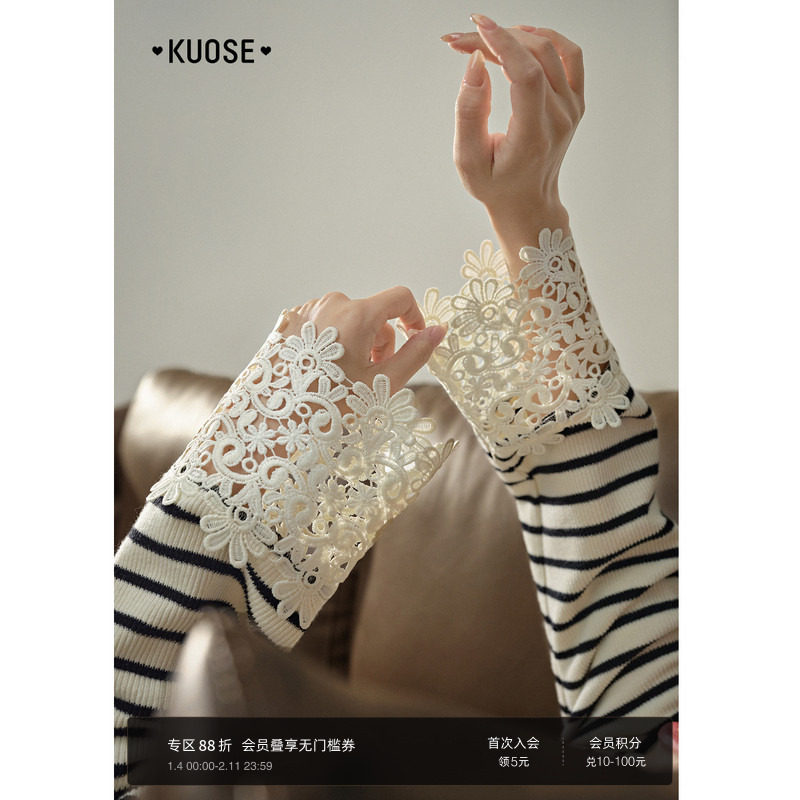 阔色条纹长袖t恤女2025秋冬季新款白色内搭打底衫设计感蕾丝花边