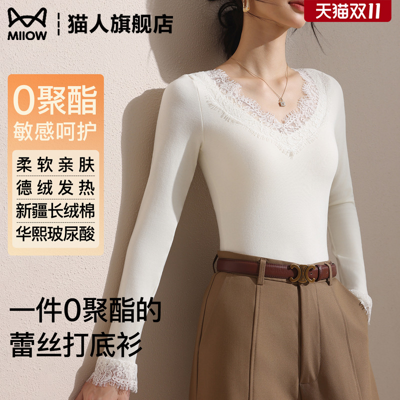 蕾丝打底衫女内搭高级感2025新款早秋冬修身长袖V领白色内搭上衣