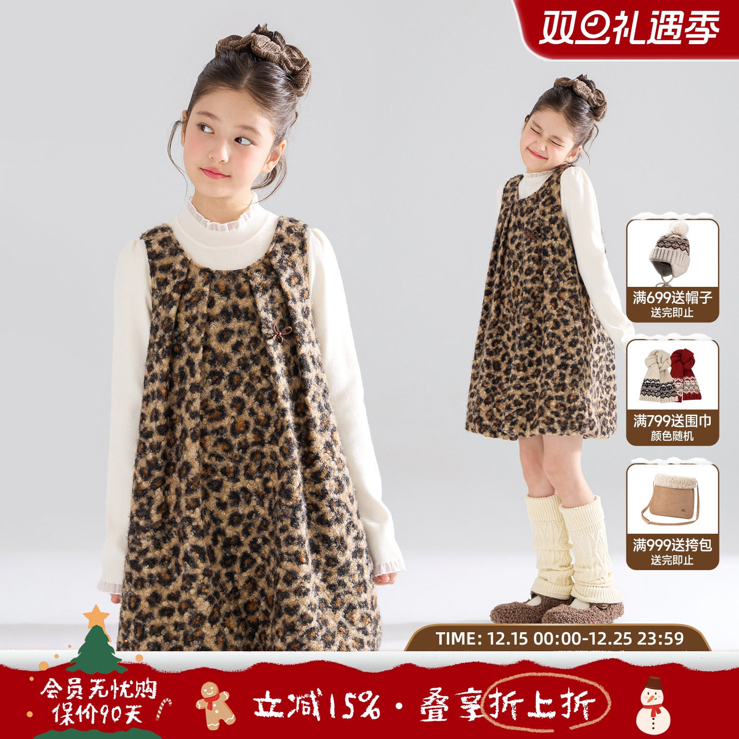 MUCMUKN【豹纹kitty】立体圈圈毛呢花苞连衣裙子百搭女童25冬新款