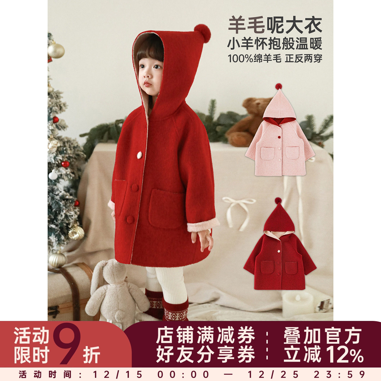 幼悠女童2025冬季新款正反两穿羊毛呢大衣连帽保暖外套女孩拜年服