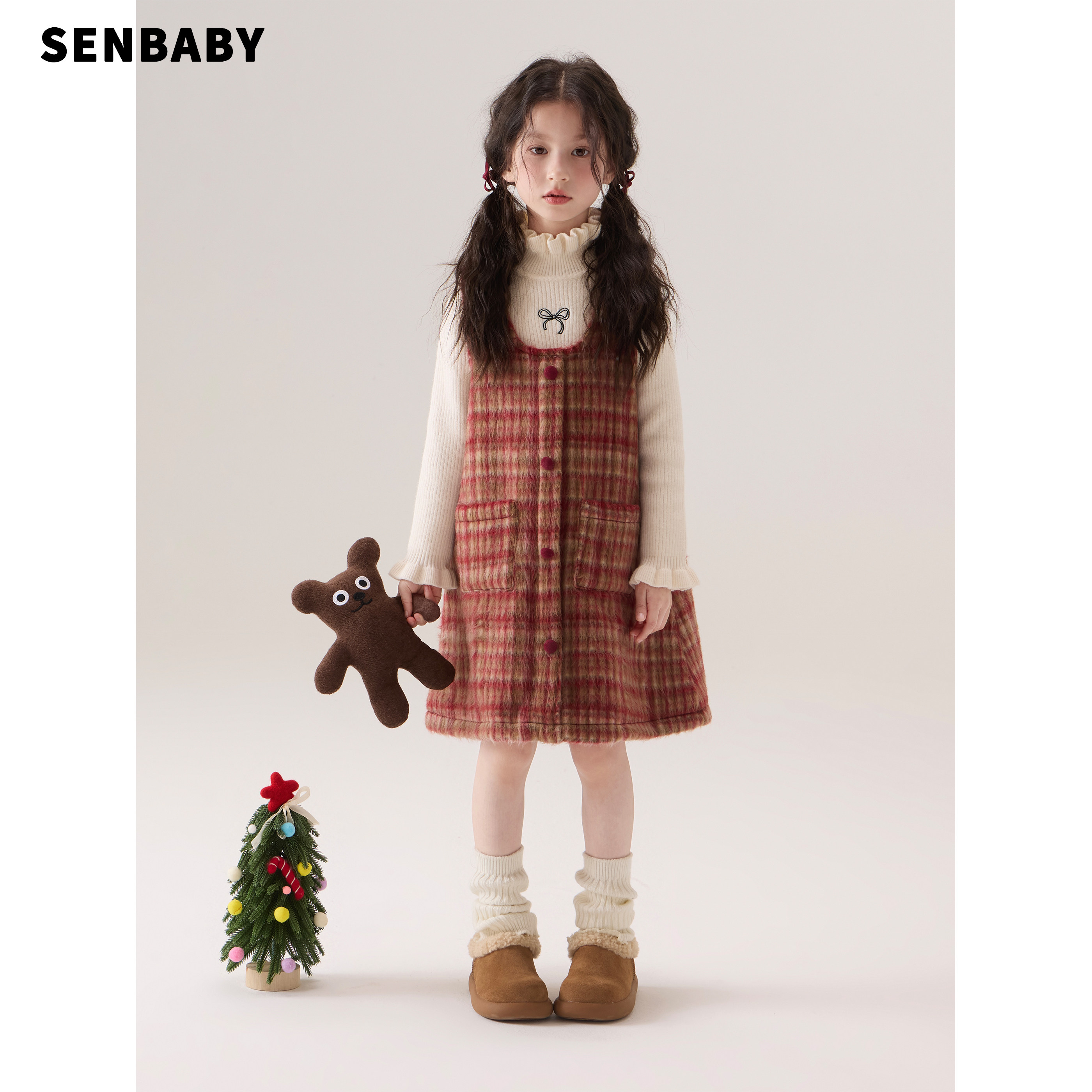 senbaby童装女童冬季加绒背心裙新年圣诞长毛呢背带裙无袖格子裙