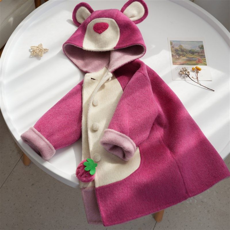 草莓熊双面羊毛大衣儿童可爱卡通连帽毛呢女童中长款玫红色外套厚