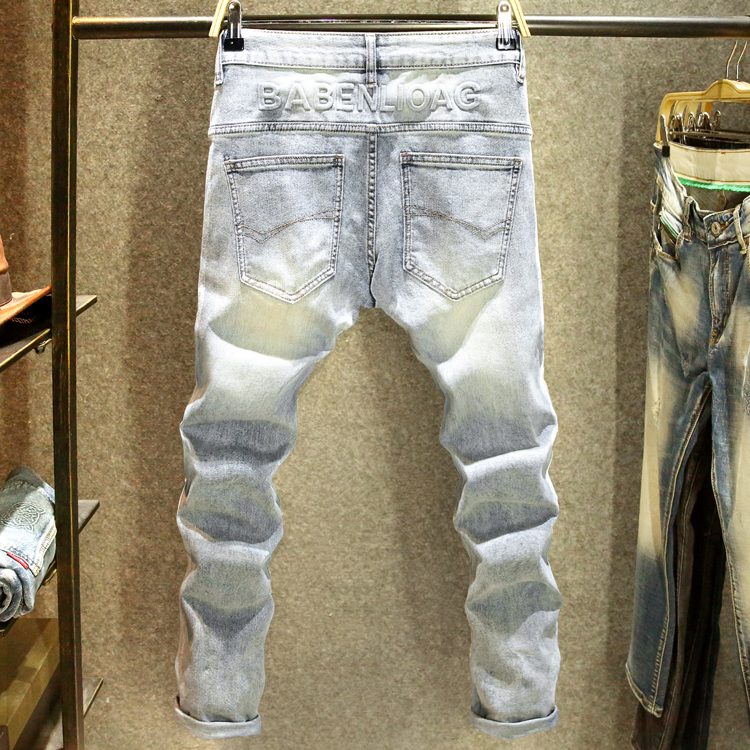 高街立体压花夏季牛仔裤男弹力修身小脚裤浅蓝色潮牌设计感长裤子