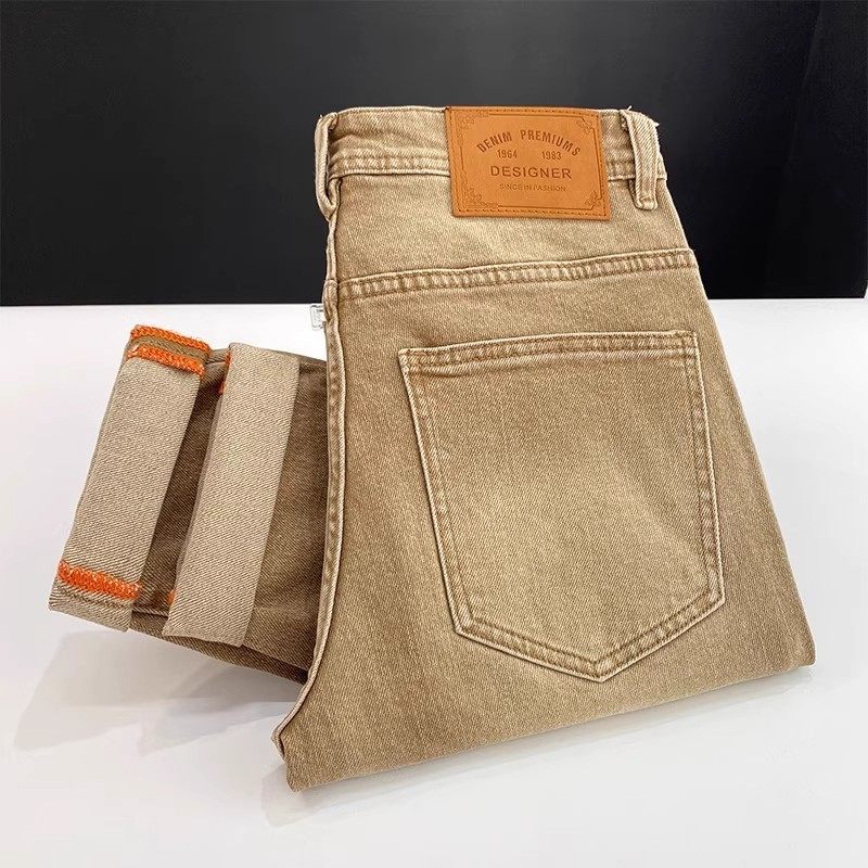 2025新款卡其色牛仔裤男轻奢做旧水洗简约休闲弹力修身小脚长裤子