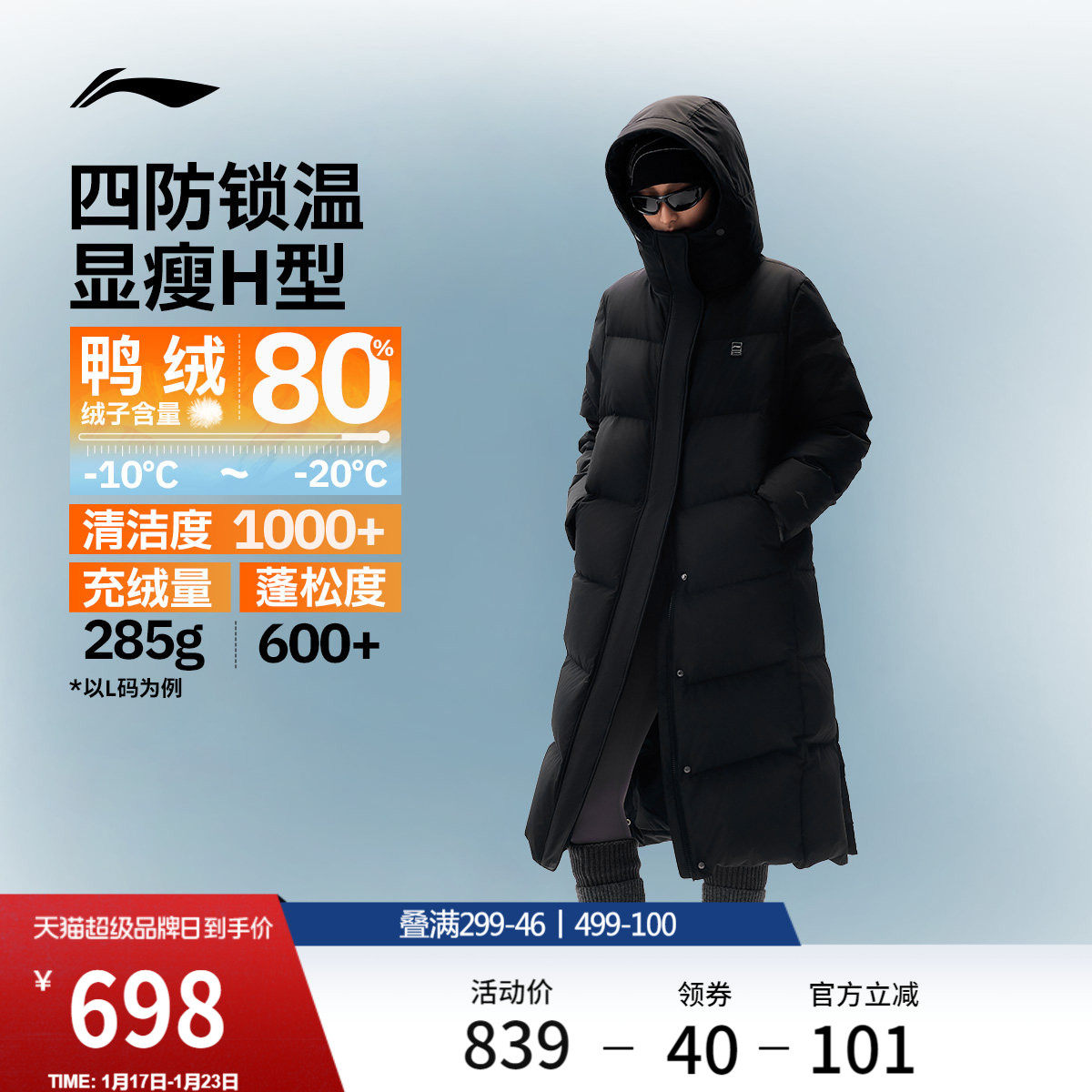 李宁航天动态保暖羽绒服女士官方新款冬季长款保暖连帽鸭绒运动服