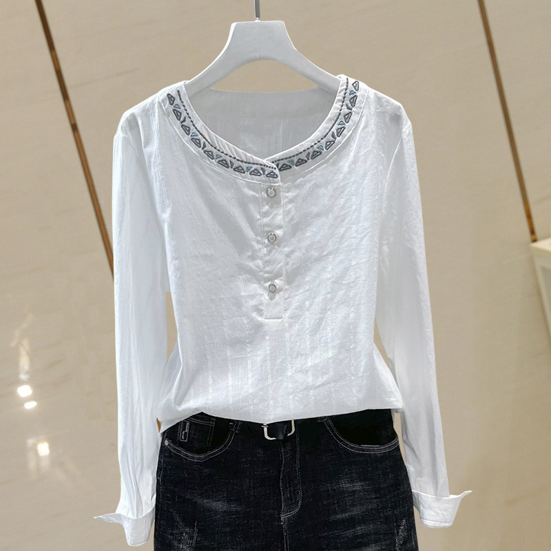 复古圆领长袖衬衫2025秋季新纯棉绣花打底上衣女韩范简约小衫百搭