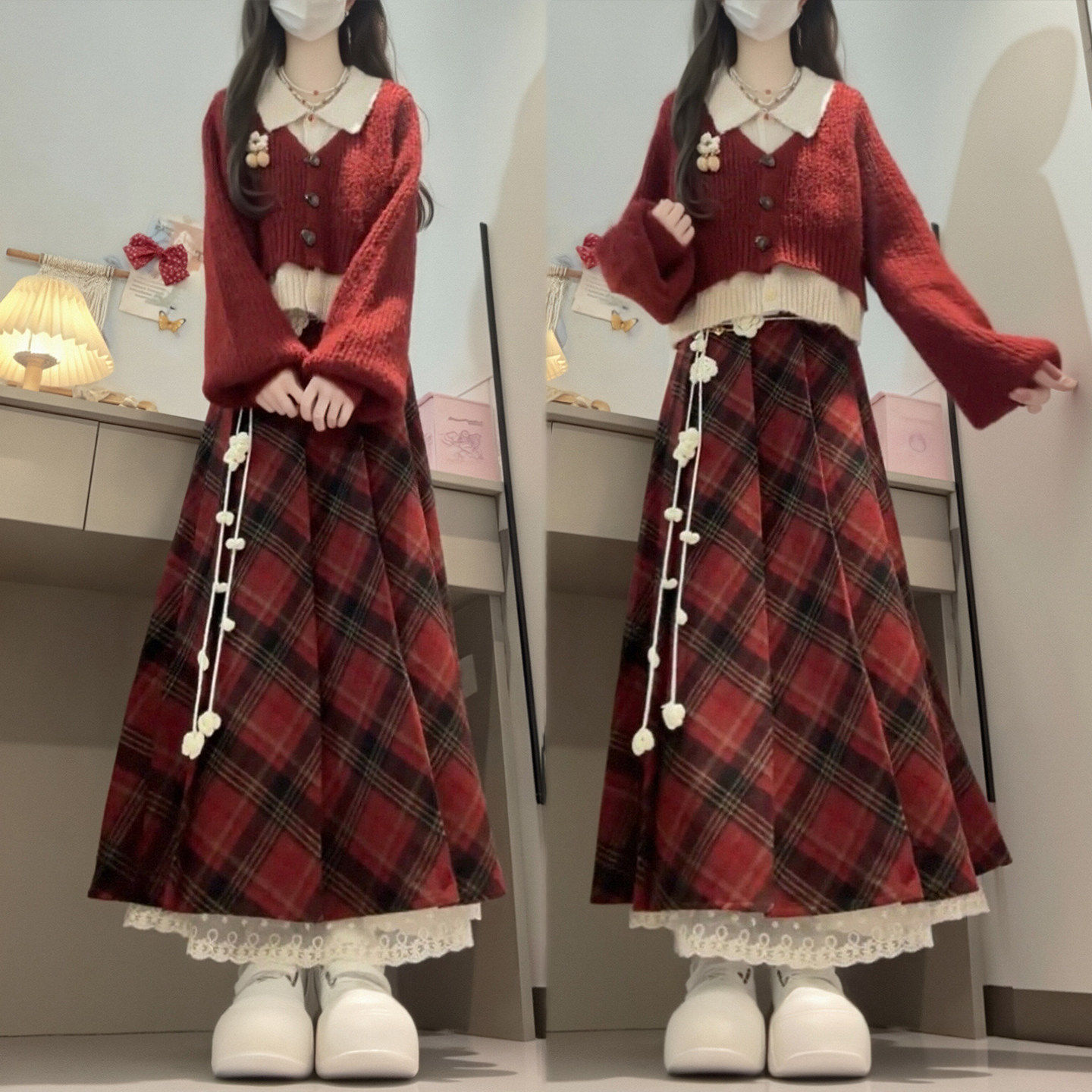 跨年穿搭红色两件套装女秋冬装穿搭一整套针织开衫格纹半身长裙子