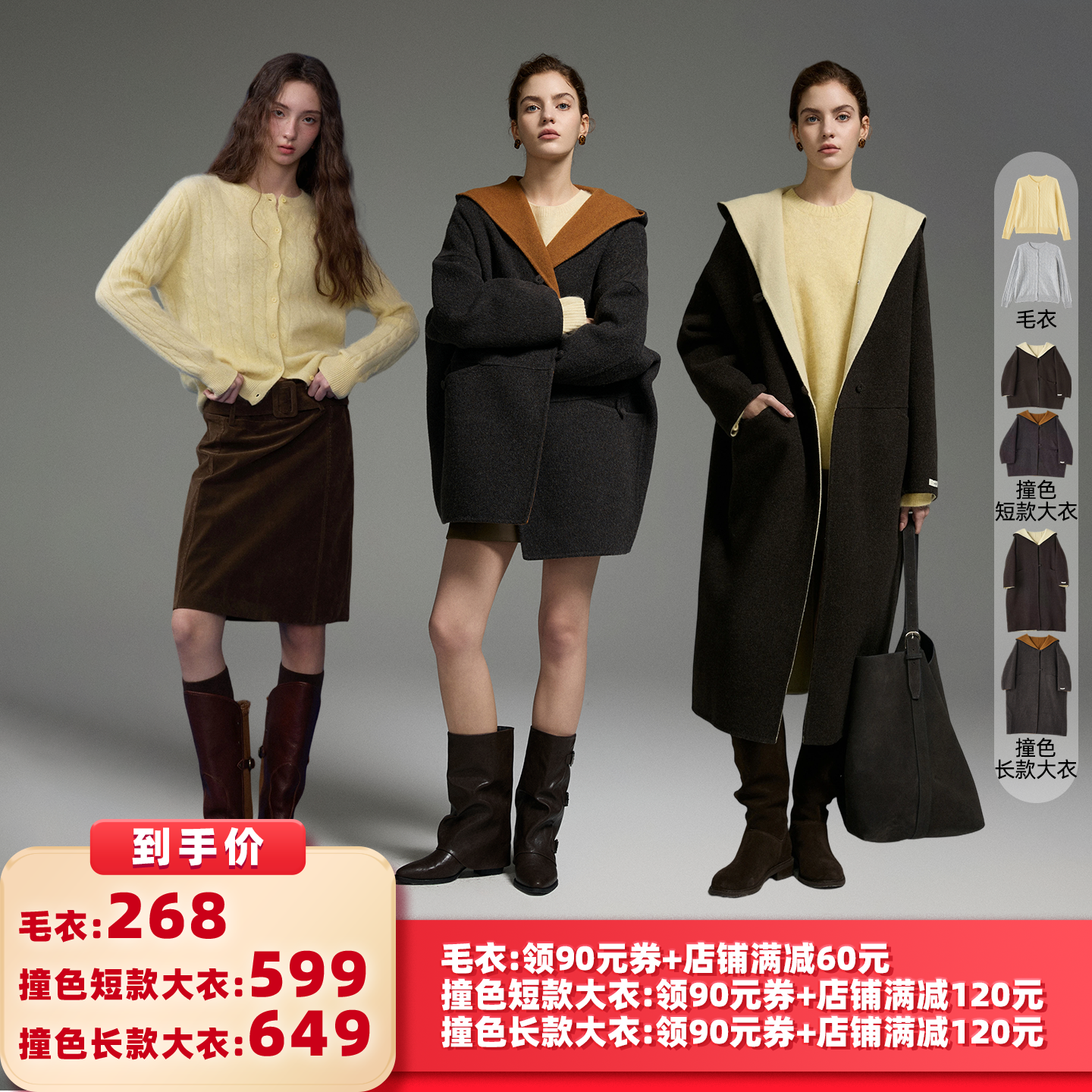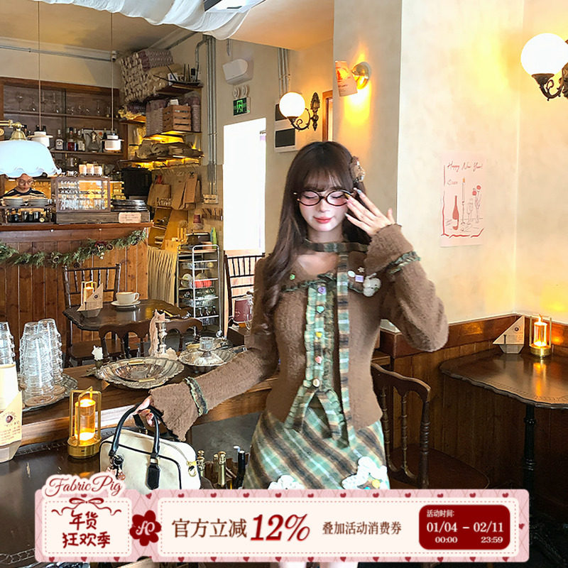 织物猪 可可松露 甜美风套装毛针织开衫上衣女秋冬格纹绣花长裙子