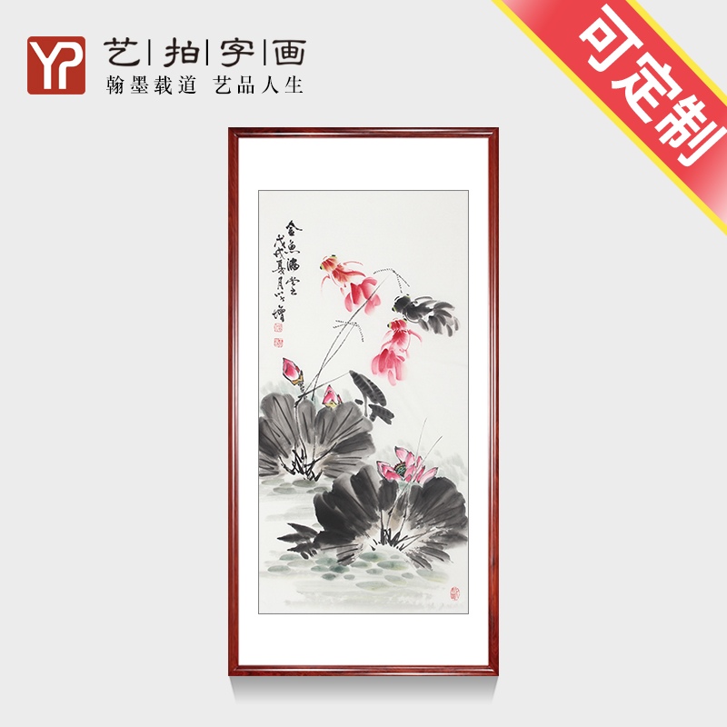 手绘九鱼图风水竖幅玄关中式装饰画荷花壁画客厅挂画连年有余字画