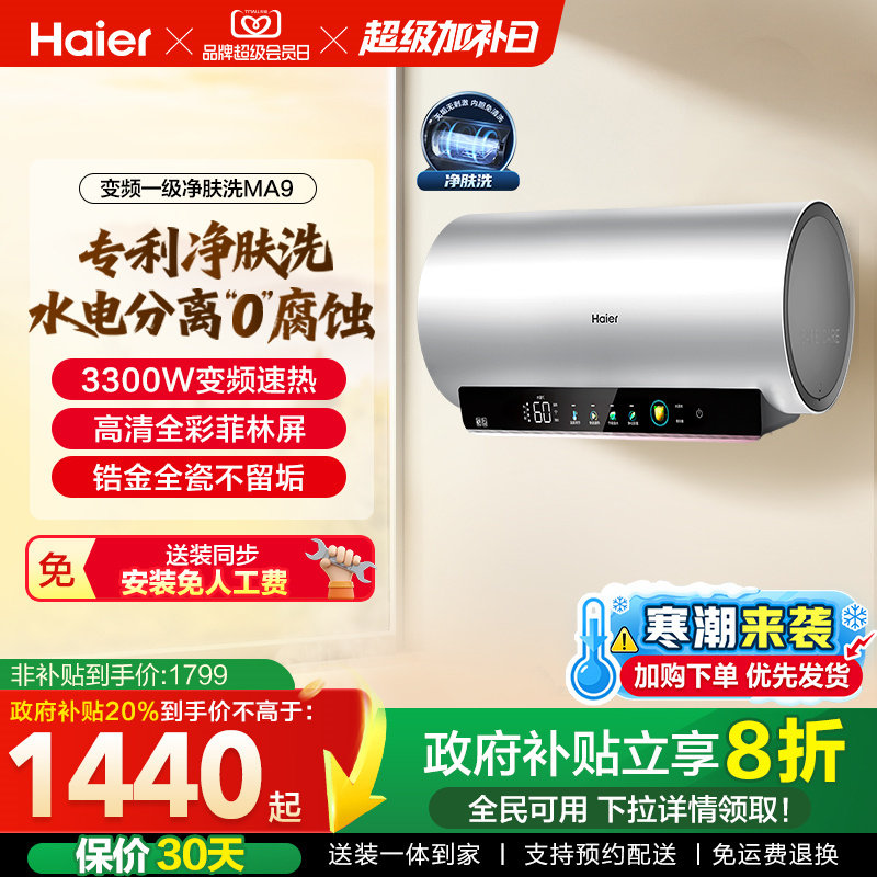 海尔电热水器以旧换新官方节能速热60升净肤洗澡一级能效家用MA9