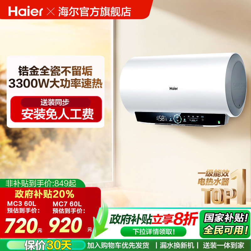 [政府换新补贴]海尔电热水器官方家用卫生间洗澡一级能效MC3pro