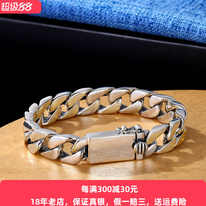S925纯银简约朋克光牛仔牌手链韩版时尚霸气潮男银士链子定制刻字