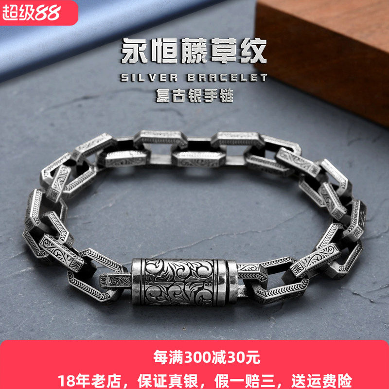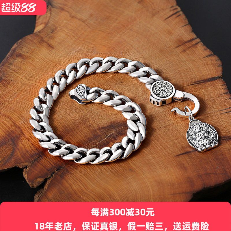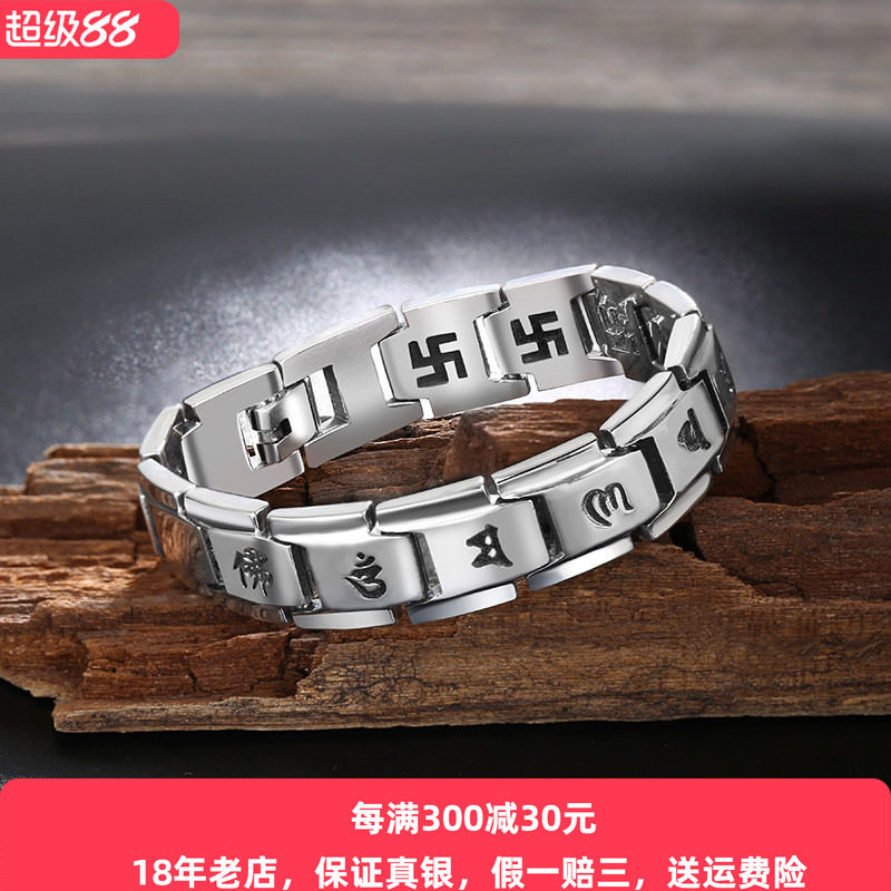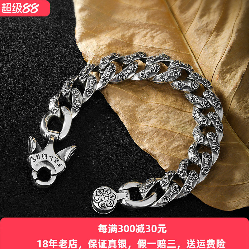 【好运】六字真言手表带纯银男士手链潮男个性韩版复古泰银朋克创