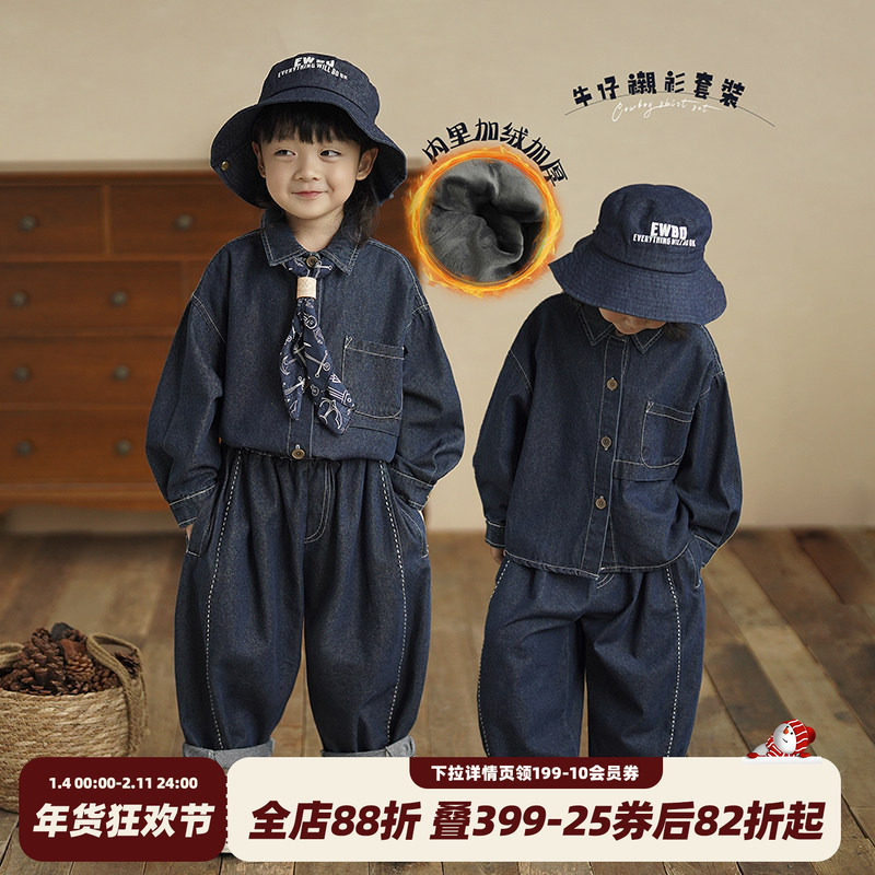 砚台家男童牛仔套装2024秋冬季新款幼童牛仔裤儿童衬衫加绒两件套