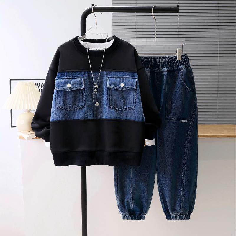 牛仔拼接高级感卫衣男韩版2025秋新款青少年新款中大男童牛仔套装