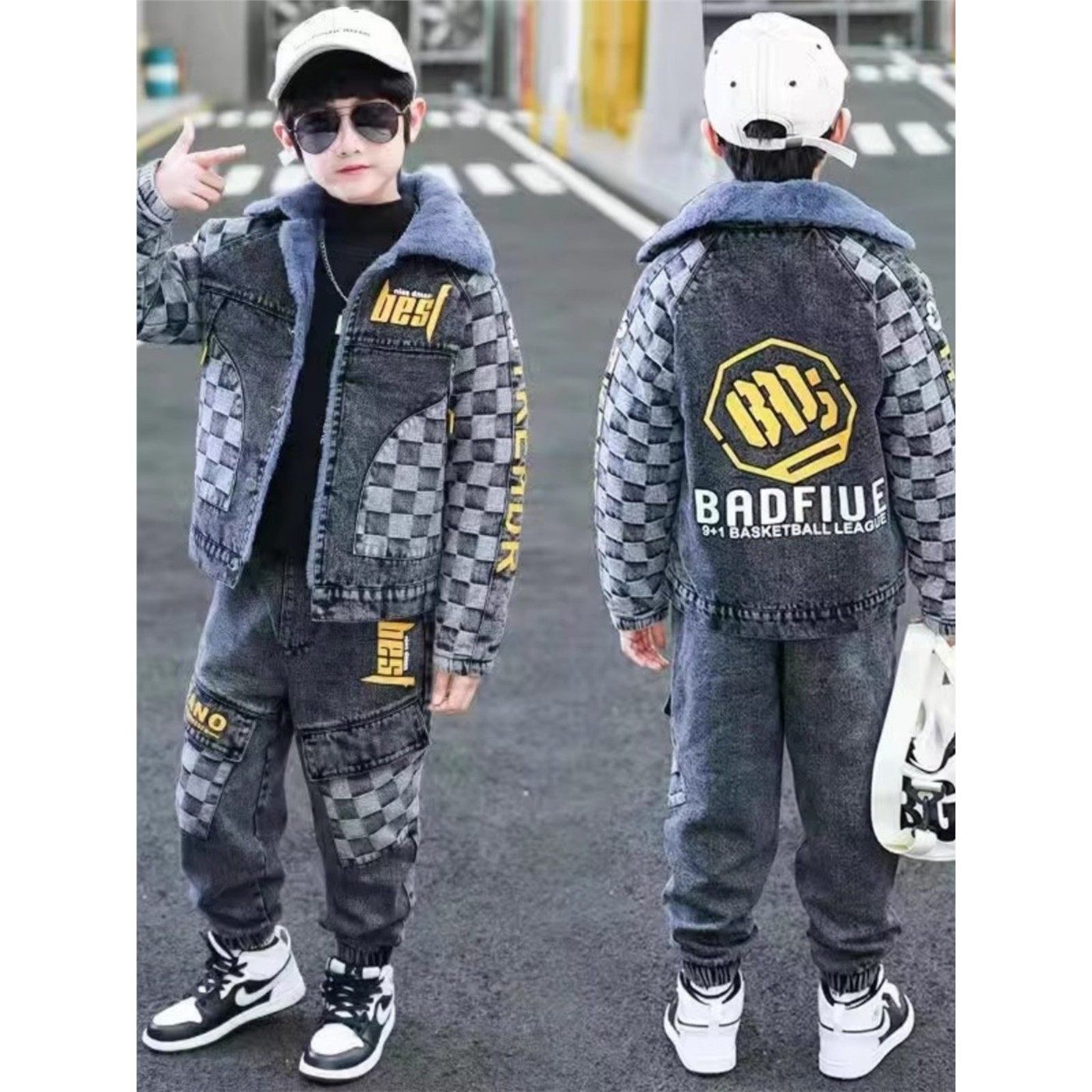 男童牛仔套装儿童加绒加厚保暖潮流时尚风格帅气小男孩小学生童装