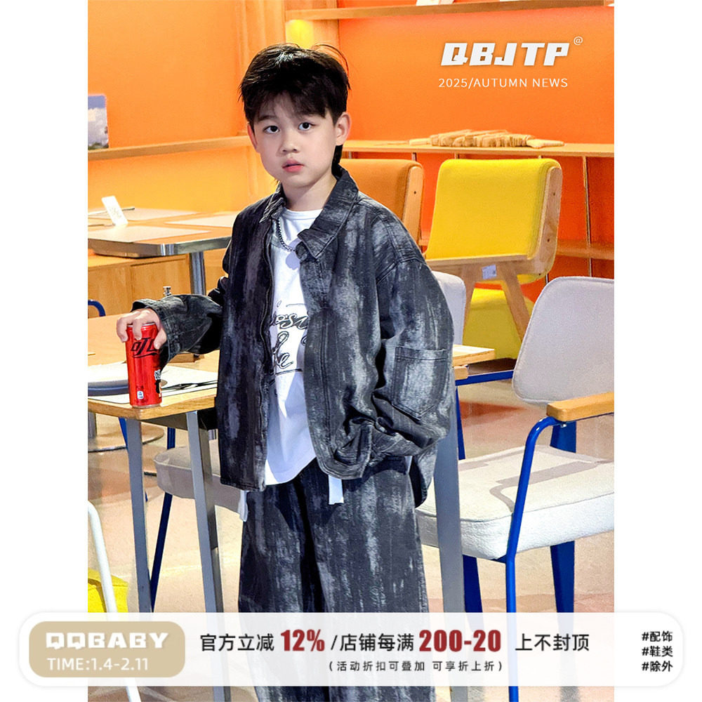 Q宝家童品9月新款 男童牛仔套装秋款儿童扎染外套牛仔裤子两件套