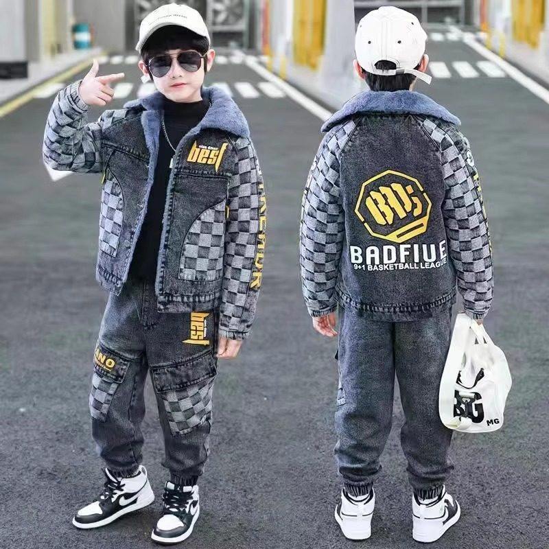 男童加绒加厚牛仔套装2026新款中小大童时尚小男孩儿童冬季小香风