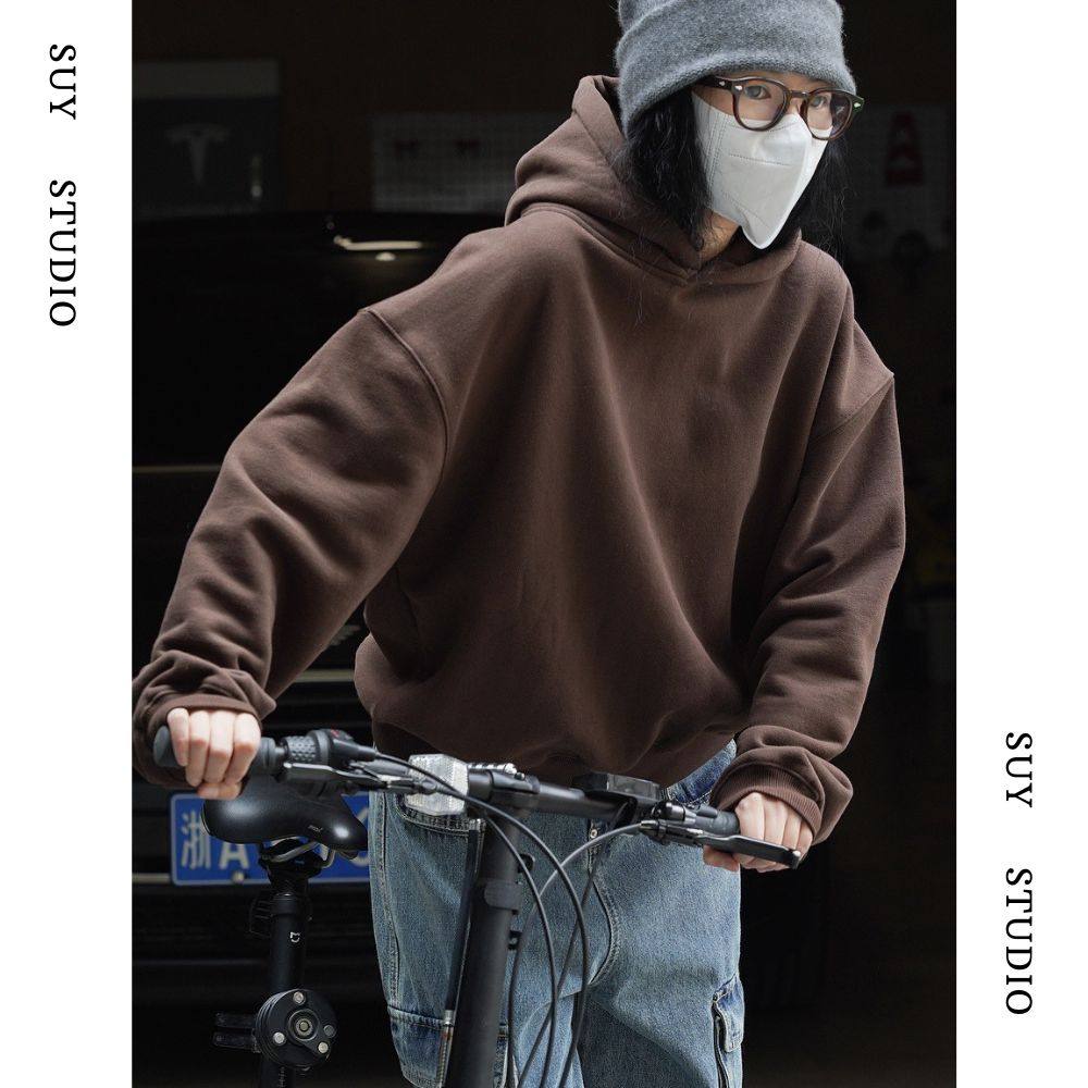 欧货秋冬新款韩系休闲带帽卫衣宽松美式简约套头连帽加绒厚款上衣