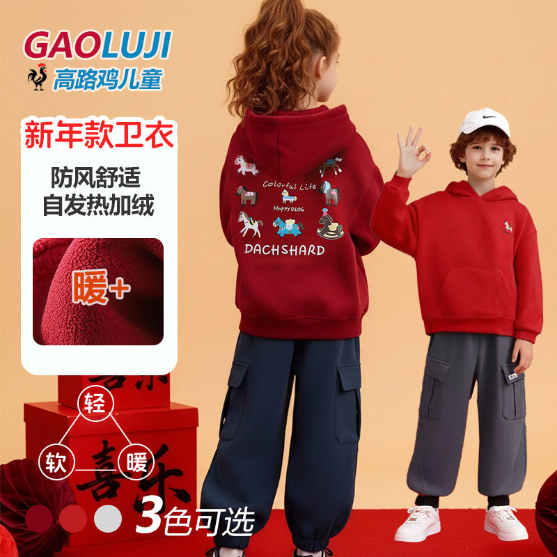 男女大童套头连帽加绒卫衣新年款厚款保暖防风喜庆红色拜年服卫衣