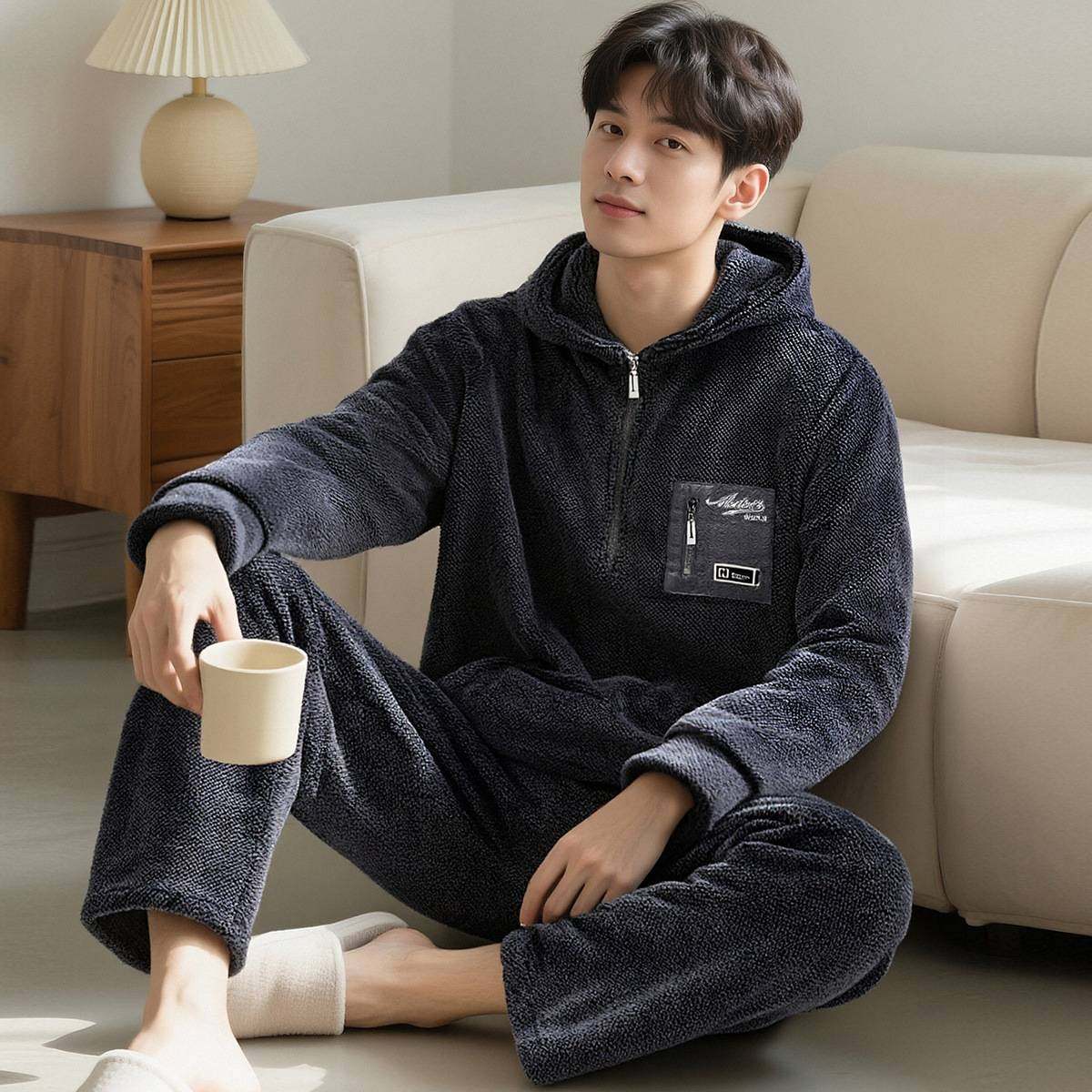 官方正品轻暖绒睡衣男冬季套头连帽加绒加厚秋冬法兰绒男士家居服