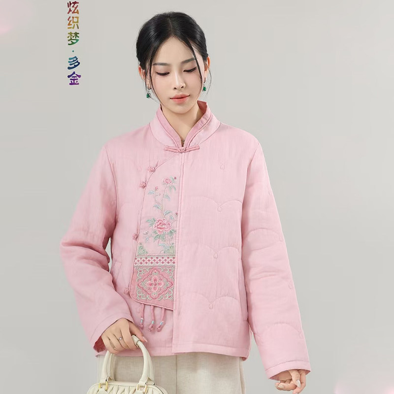 炫织梦多金2025秋冬新中式立领斜襟盘扣苎麻刺绣加棉民族风棉服女