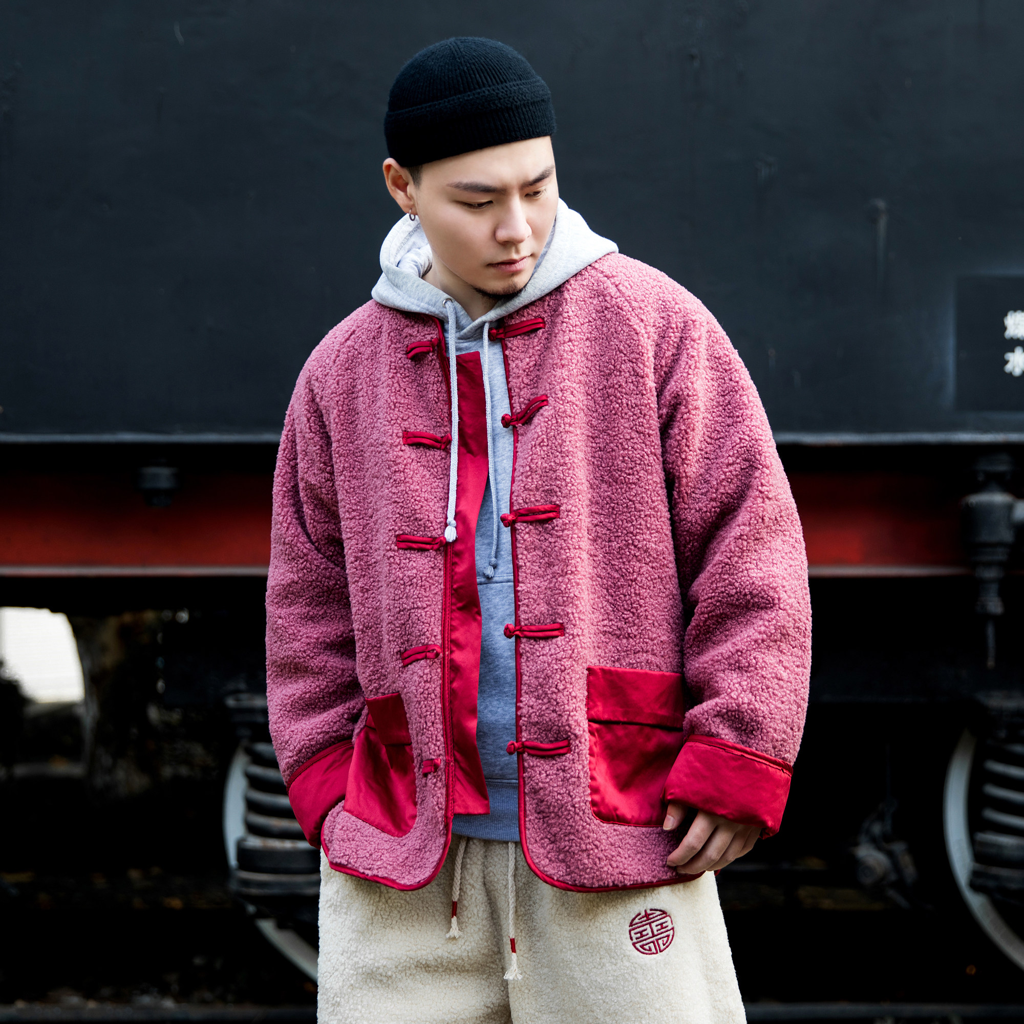 中国风气质撞色羊羔毛外套男潮冬季外穿盘扣棉衣宽松民族风棉服女