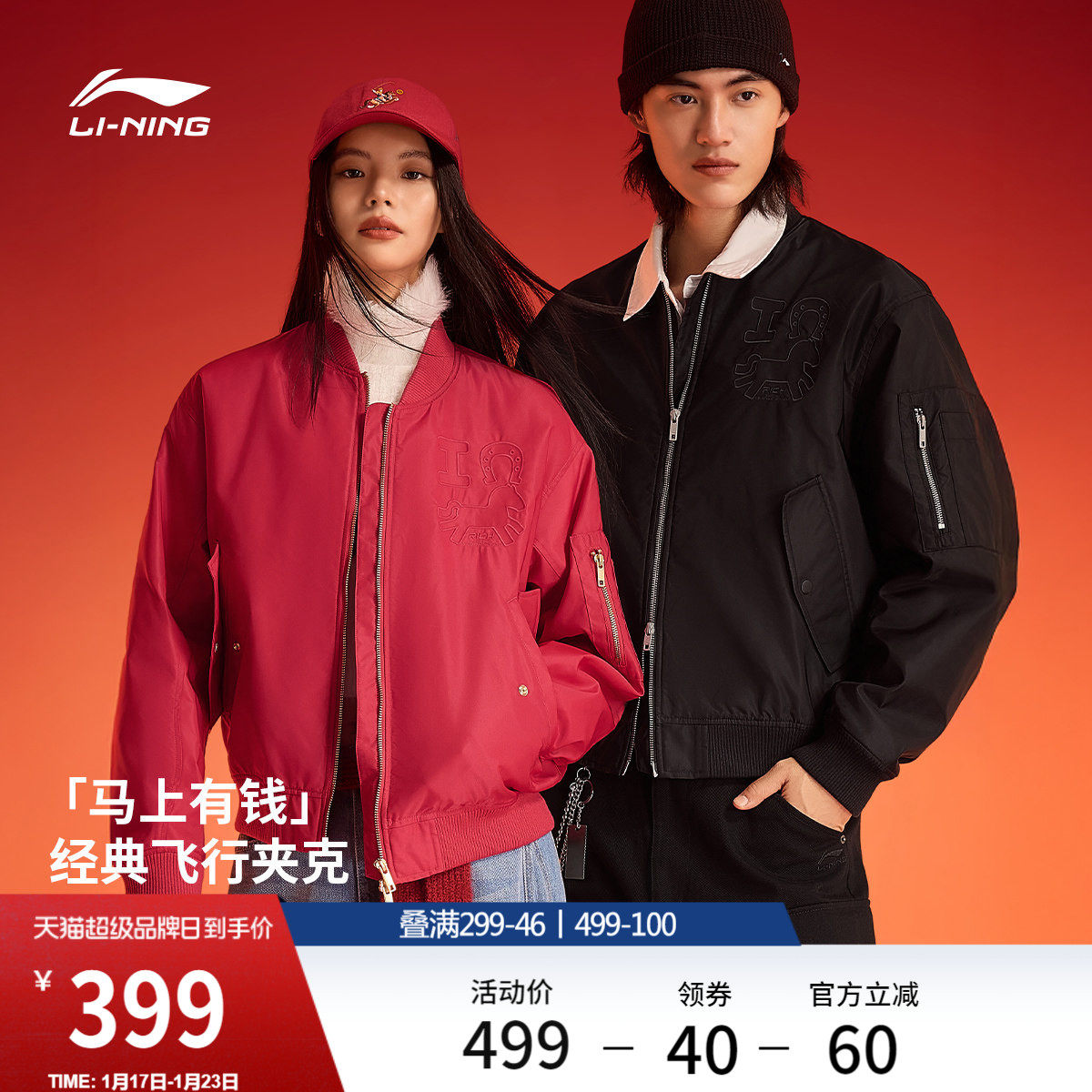 李宁马上有钱棉服女春季新款新年棉袄子红色情侣棒球服飞行夹克男