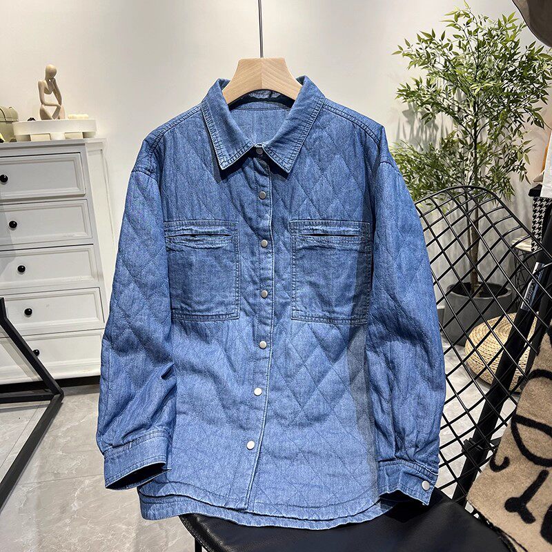 秋冬新款菱形薄款夹棉牛仔衬衫女宽松百搭两面穿长袖打底衬衣女潮