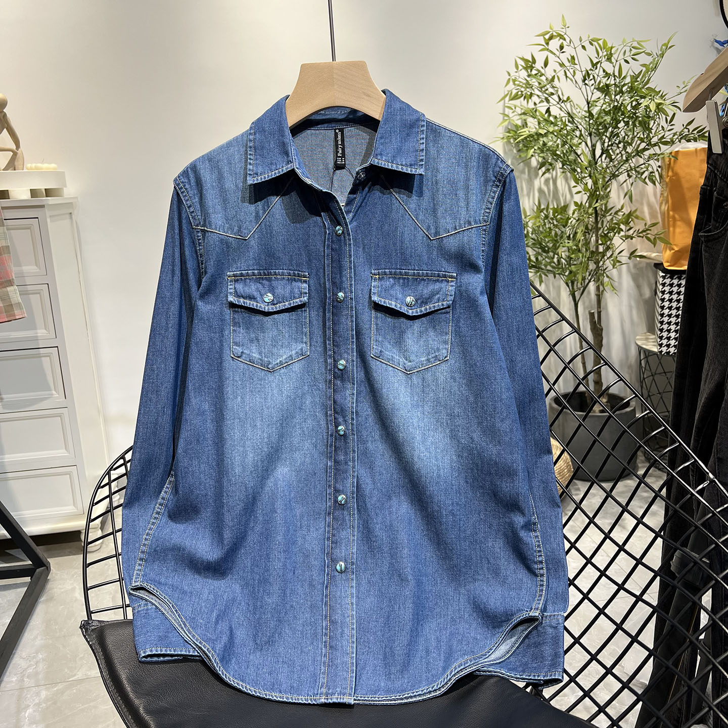 早秋新款气质打底衬衣女松弛感老钱翻盖口袋设计叠穿休闲牛仔衬衫