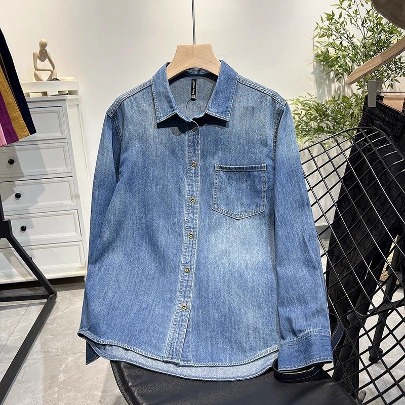 秋季新款时尚水洗全棉牛仔衬衫女百搭休闲长袖翻领打底衬衣女上衣