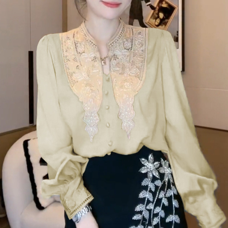 法式宫廷风蕾丝奶茶系时尚品质衬衫2025春新气质打底衬衣女2595