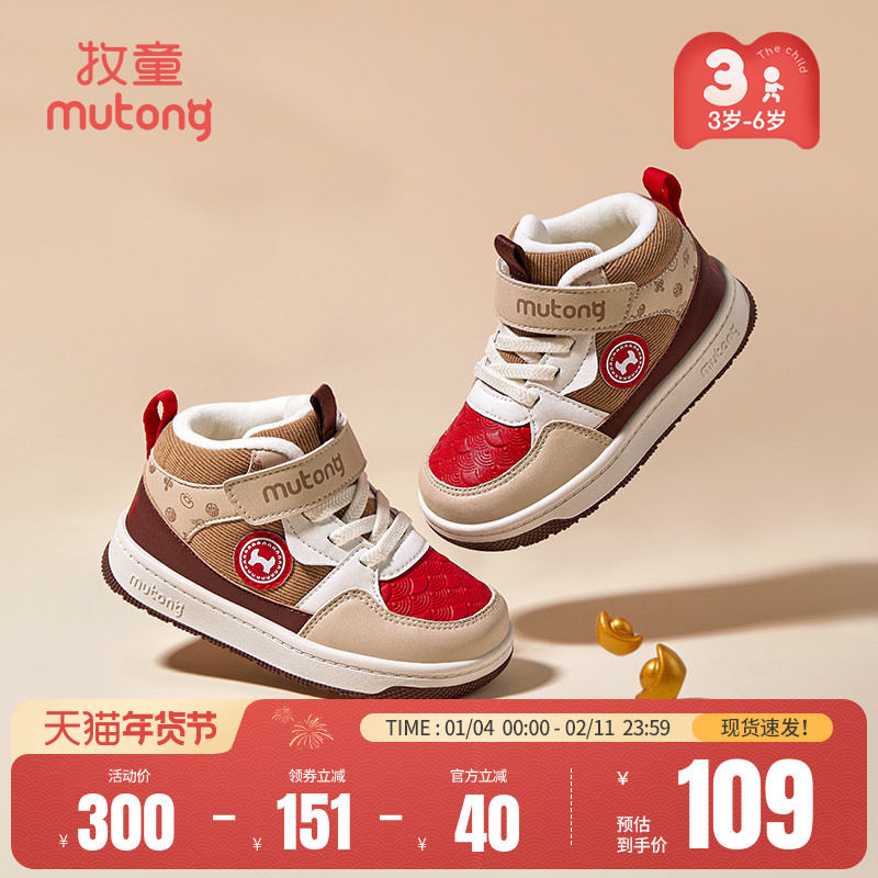 牧童童鞋2025冬季新款女童加绒鞋红色国风祥云板鞋男童二棉鞋加厚