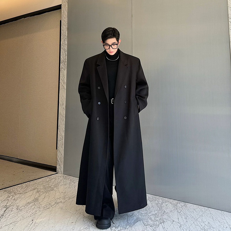 Hualun冬季双排扣毛呢大衣男长款过膝风衣韩版高级感设计外套男装
