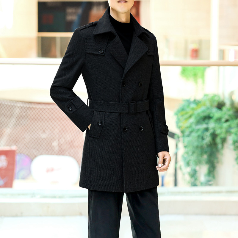 男秋冬中长款风衣双排扣英伦大衣腰带款保暖厚中青年毛呢工装外套