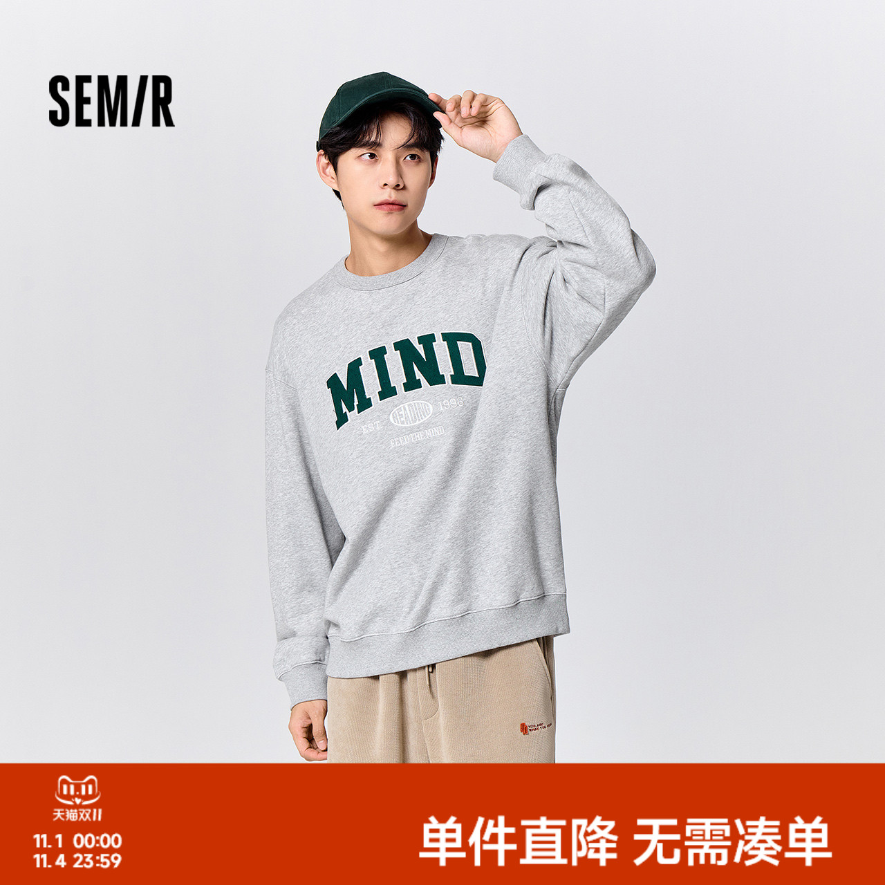 森马卫衣男冬季复古学院风字母刺绣抓绒宽松落肩圆领上衣时尚潮流