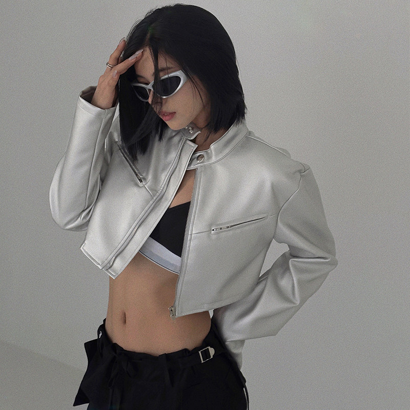 H家欧美女装 酷飒机车风未来感银色皮革短外套潮赛博朋克立领上衣