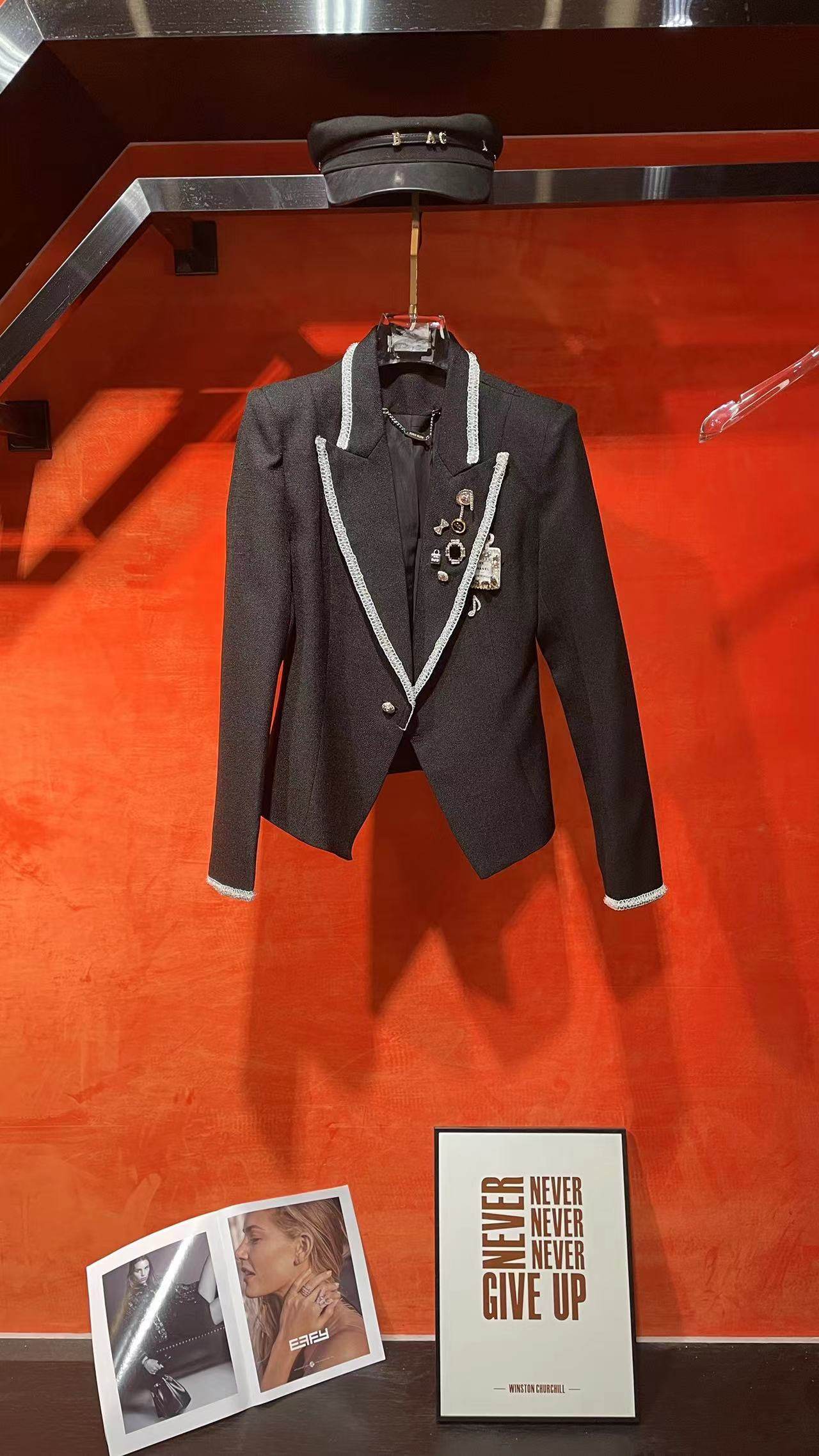 7573春季新款时尚银色扣修身显瘦女重工钉珠纯色气质西装外套潮白