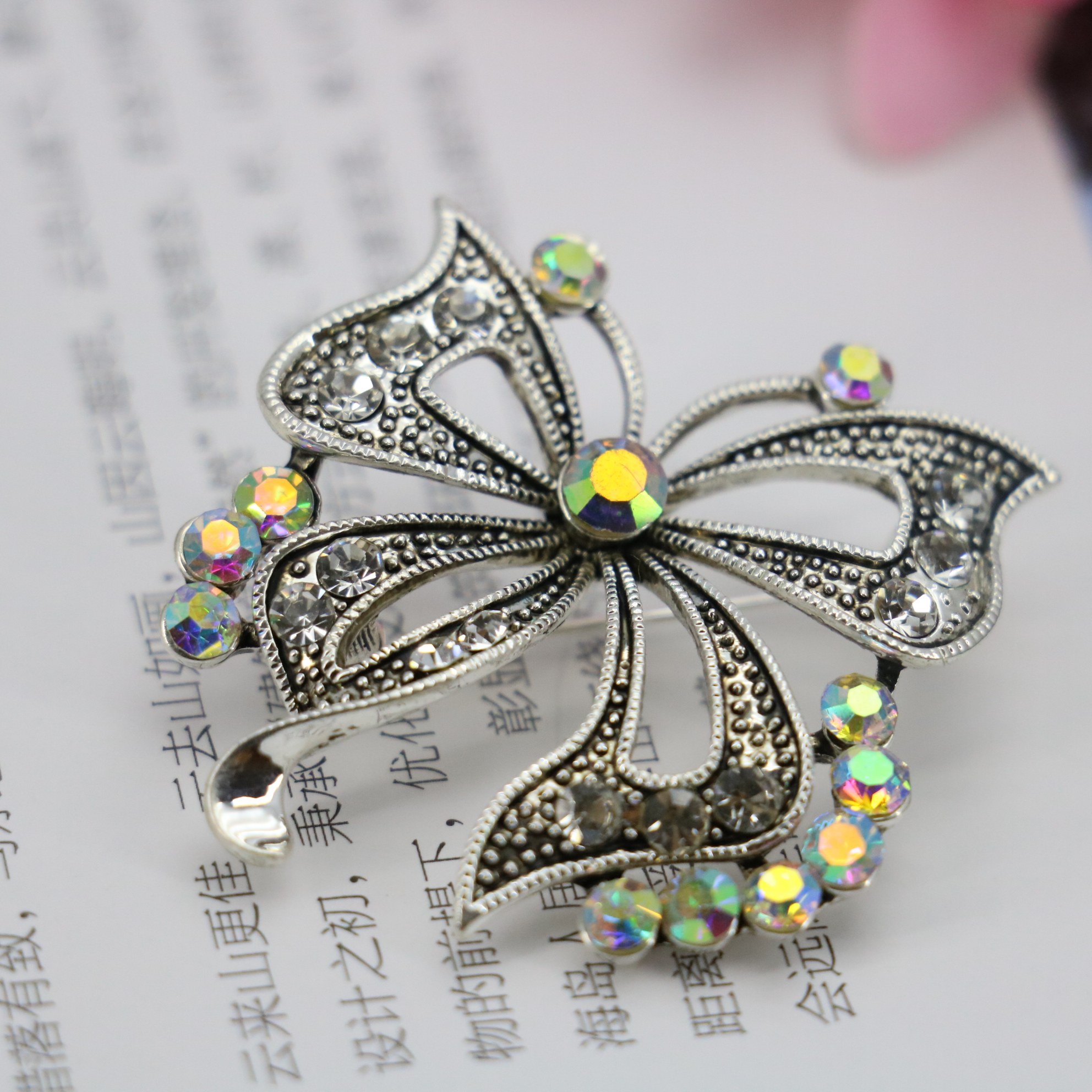 38X39MM水晶蝴蝶结女款胸针 西装外套衬衫配饰合金银色披肩夹子潮