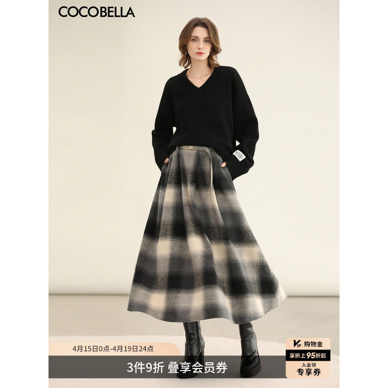 COCOBELLA英伦风格纹毛呢半身裙女秋冬知性气质A字大摆长裙HS3096