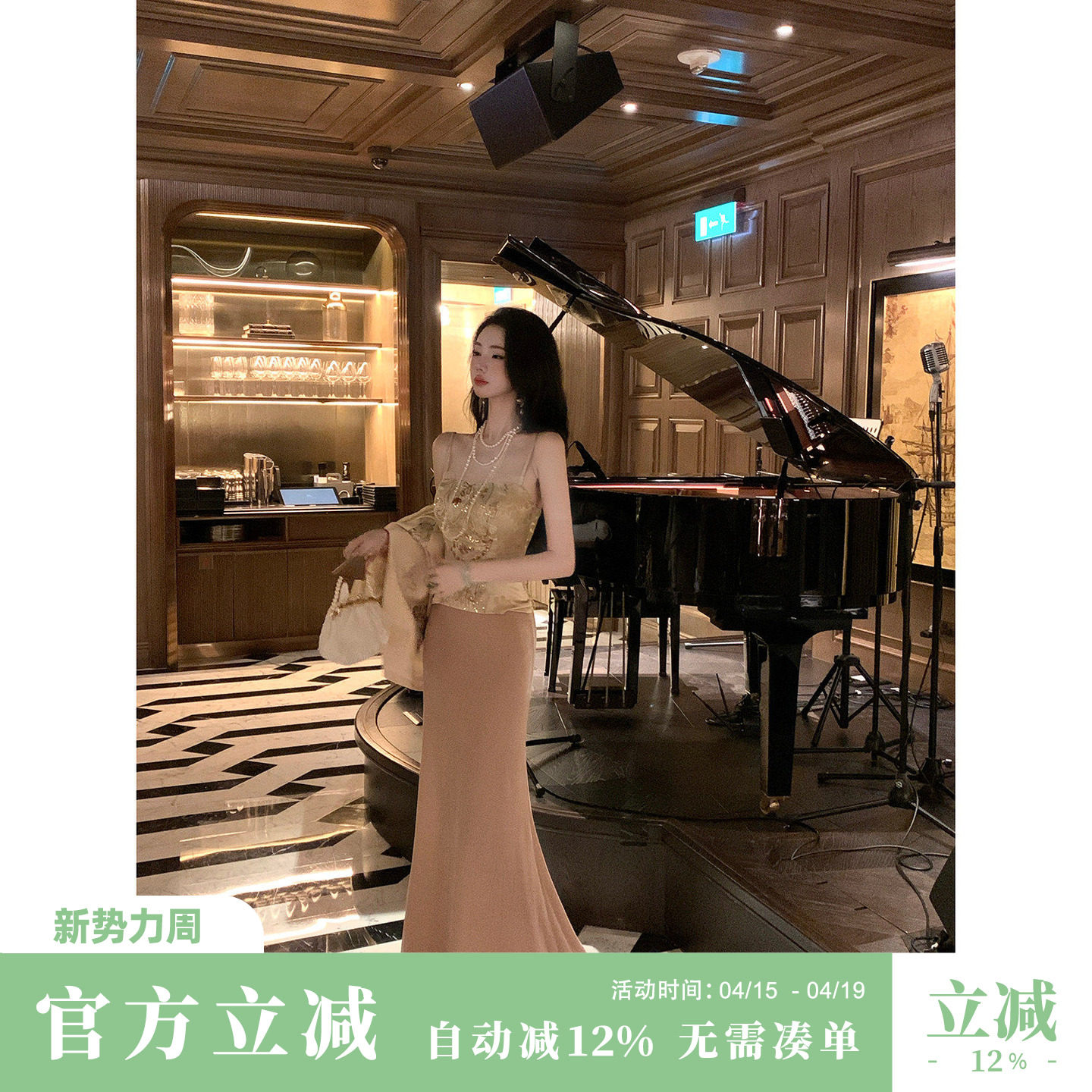 Girlyhalo美式复古不规则彩砂拼接半身裙女秋冬高腰中长款A字长裙
