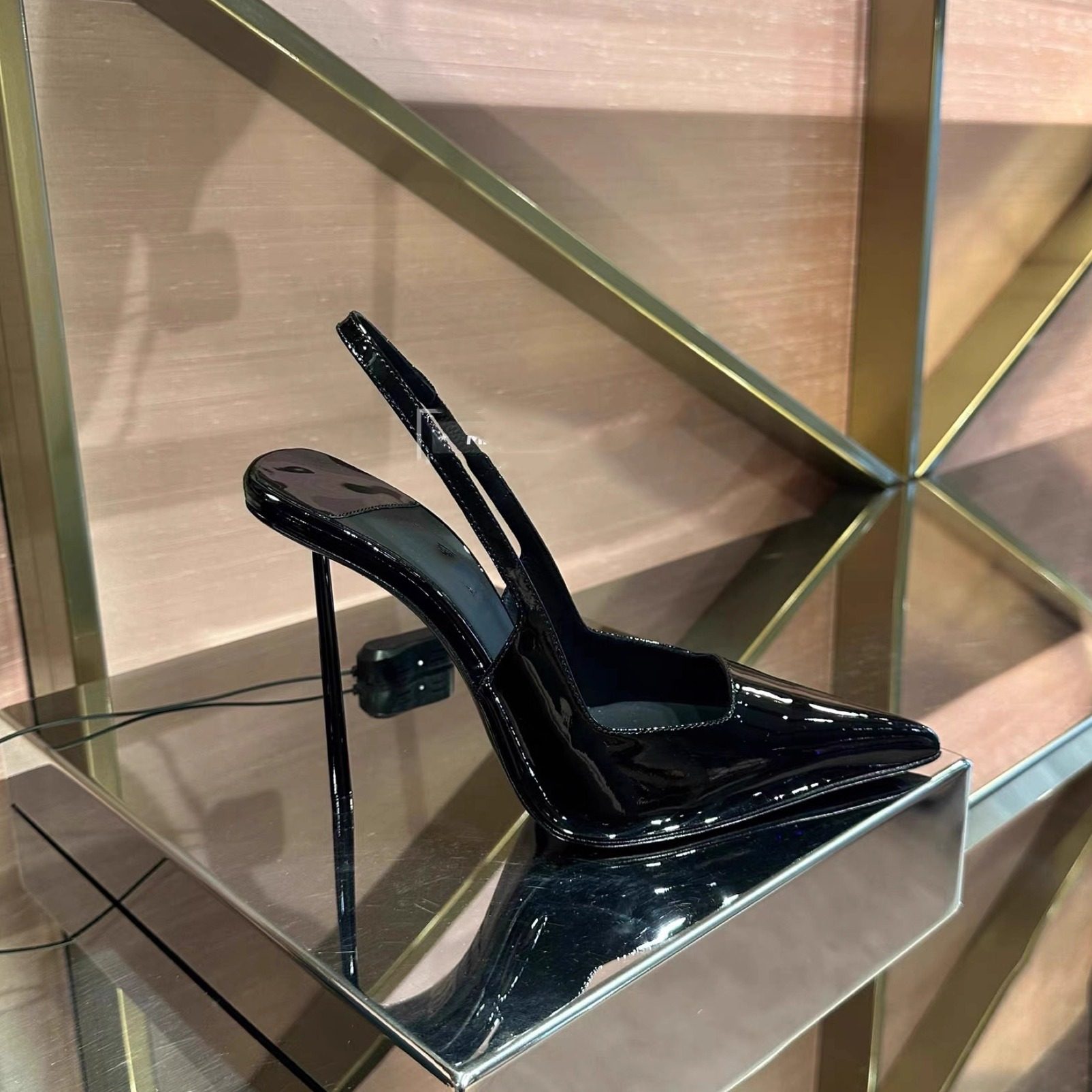 欧美黑色漆皮尖头超浅口红底一字带高跟鞋女细跟交叉绑带凉鞋单鞋