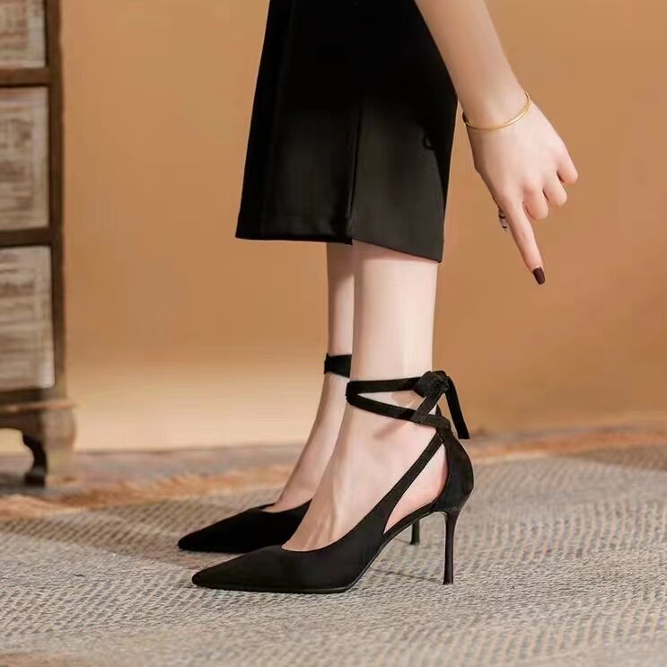 2026新款一字带水钻绒面高跟鞋细跟尖头绑带包头凉鞋性感绝美单鞋